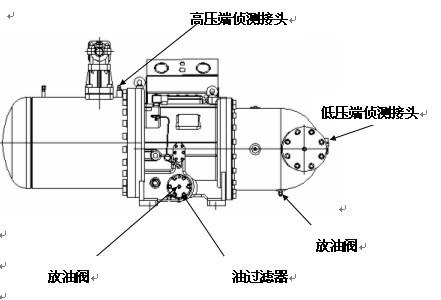 2.壓縮機(jī)的潤滑油,從油過濾器上的放油閥處放出,潤滑油接近放完時,從壓縮機(jī)的高壓端偵測接頭處,注入一定壓力的氮氣(1.0MPa左右),用壓力加快潤滑油排出,停止注入氮氣,關(guān)閉放油閥。然后將壓縮機(jī)的油過濾器拆卸下來,將油槽里的潤滑油全部放出來,再將油過濾器清洗后裝上緊固。如圖所示: